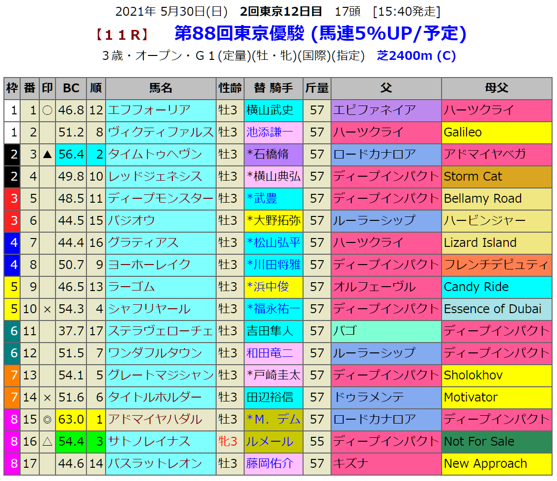 前走エフフォーリアのBC-indexの指数順位は16頭中15位ですが、今回は17頭中12位と少し上がっています。前走よりこのコースの方が血統的適性が高いという事になります。前走皐月賞では2着馬に0.5秒差をつけて勝っています。過去皐月賞で0.5秒以上の差をつけて勝った馬は過去にオルフェーブルとナリタブラインアンの2頭いますが、ともにダービーを勝ち3冠馬となっています。