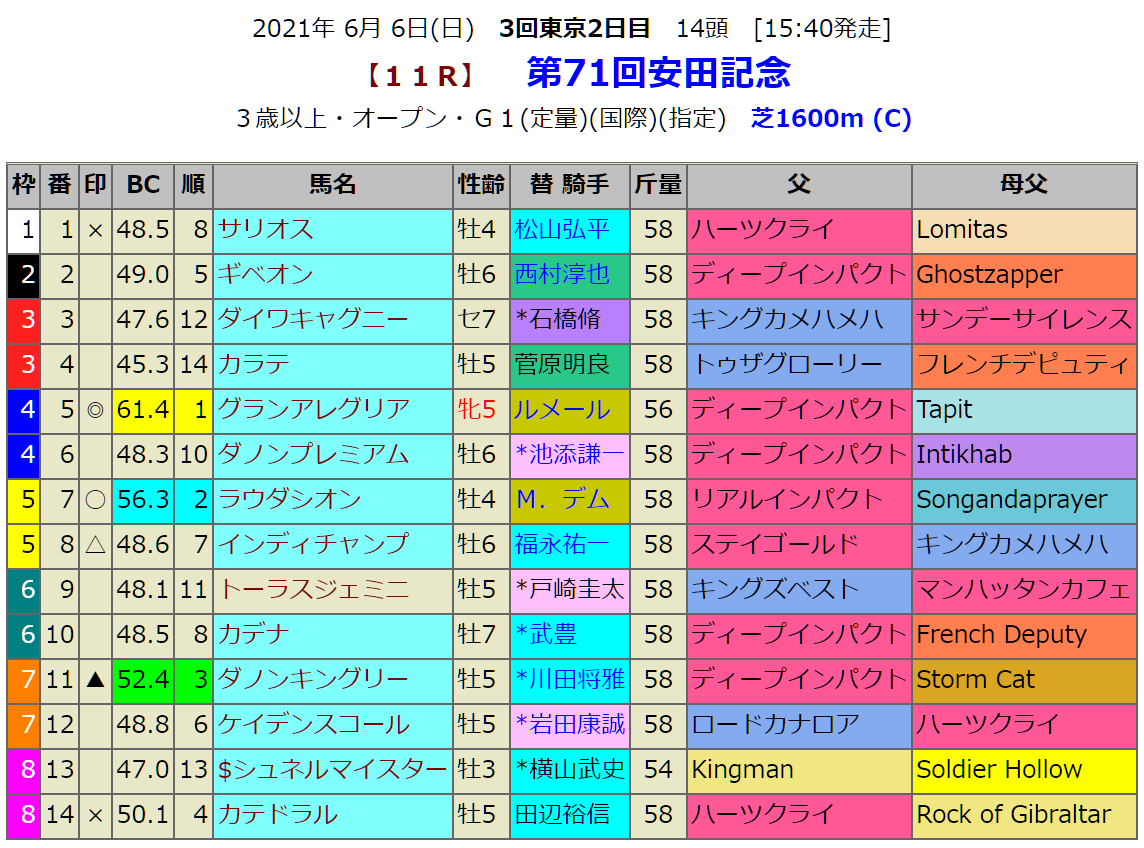 指数1位はグレンアレグリアです。連覇が懸ります。昨年の安田記念では指数が2位でしたが今年は指数1位です。グランアレグリアの指数1位時の成績は(6.0.1.1)です。ディープインパクト×A.P. Indy系という配合ですが、今年のダービー馬、シャフリヤールも同じ配合です。いま売り出し中のディープインパクト配合です。圧倒的な一番人気ですが連覇に期待です。指数2位のラウダシオンですが去年のNHKマイルCを勝った馬です。実はNHKマイルCを勝っている馬は何故かこのレースは勝てないのです(2着は6回もあるのですが)。アエロリットは2回2着になっています。ミッキーアイルは2戦して2回とも大敗しています。同じコースなのですが何故かこのような傾向にあります。今年のNHKマイルCの勝馬が出走してきましたが、評価を下げておいても良さそうです。ラウダシオンは父がこのレースを勝ってますから、2着にきてほしいところです。