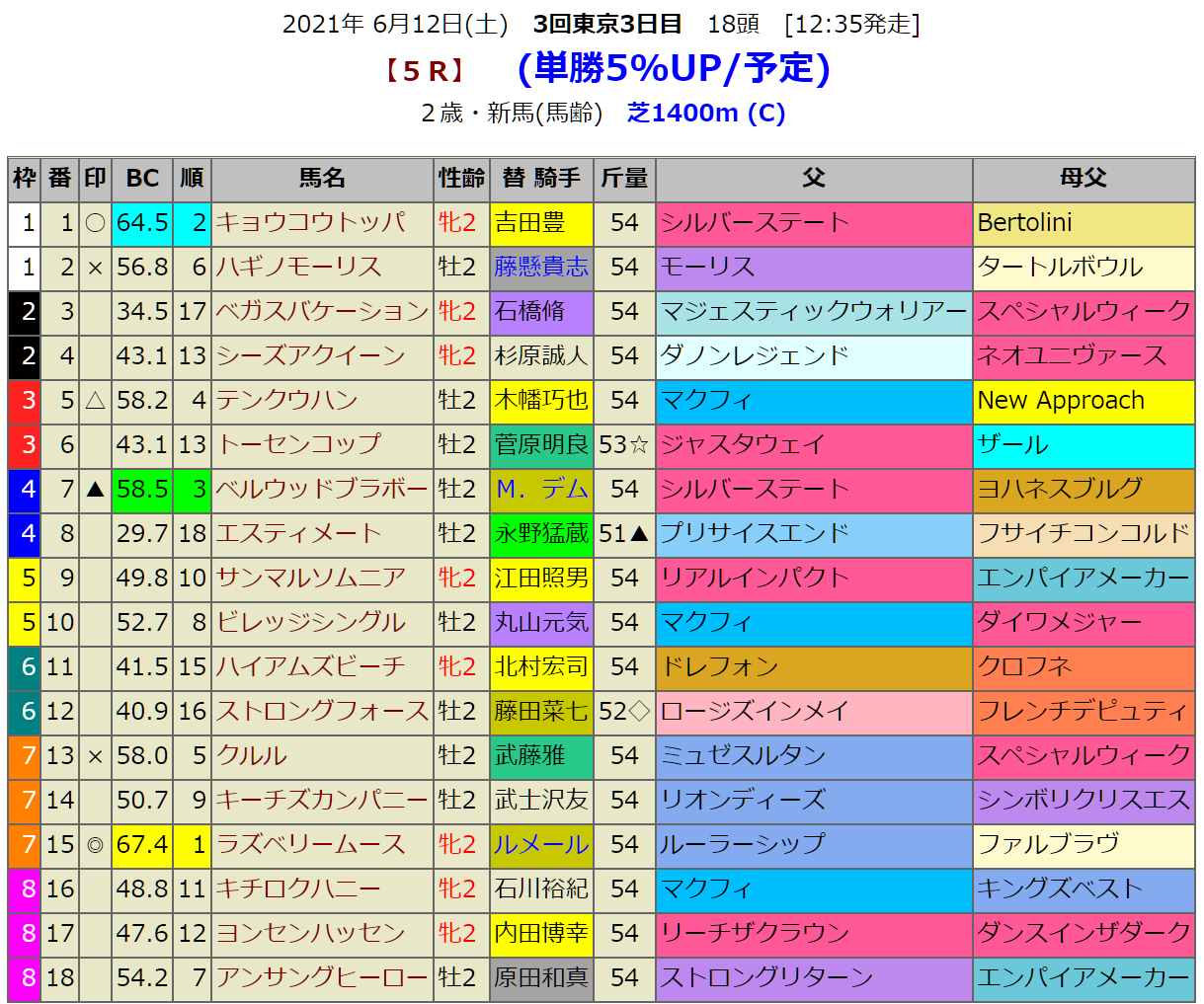 東京4Rの芝1400mの新馬戦です。実は2年連続でこの新馬戦では指数1位馬が勝っています。3年連続的中を狙います。ノーザンFの生産馬でもあるので、そこそこ仕上がっているのだと思います。近親にはオークス2着馬のベッラレイアがいる血統です。指数2位は新種牡馬シルバーステートの産駒です。シルバーステートはディープインパクト産駒でデビュー前はダービーが狙えるという逸材でした。新馬戦こそ後のG1馬に敗れ2着でしたがその後4連勝した馬ですが、途中屈腱炎で長期休養となっていました。産駒は気になるところです。
