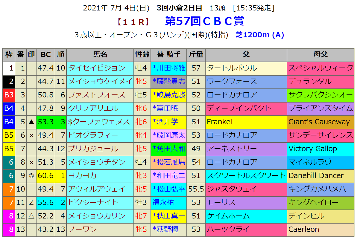 指数1位は小倉のこの距離ならヨカヨカで堅いところ。Z表示のピクシーナイトも馬券圏内を外さない馬とみます。