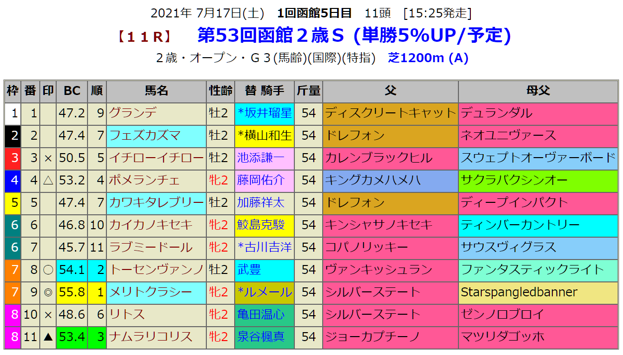 指数1位は新種牡馬シルバーステート産駒のメリトクラシーです。新馬戦では中京で指数1位で勝利していますが、函館に参戦です。このレースは前走函館組の勝利が多いのですが、鞍上にルメールという事で必勝態勢なのかもしれません。