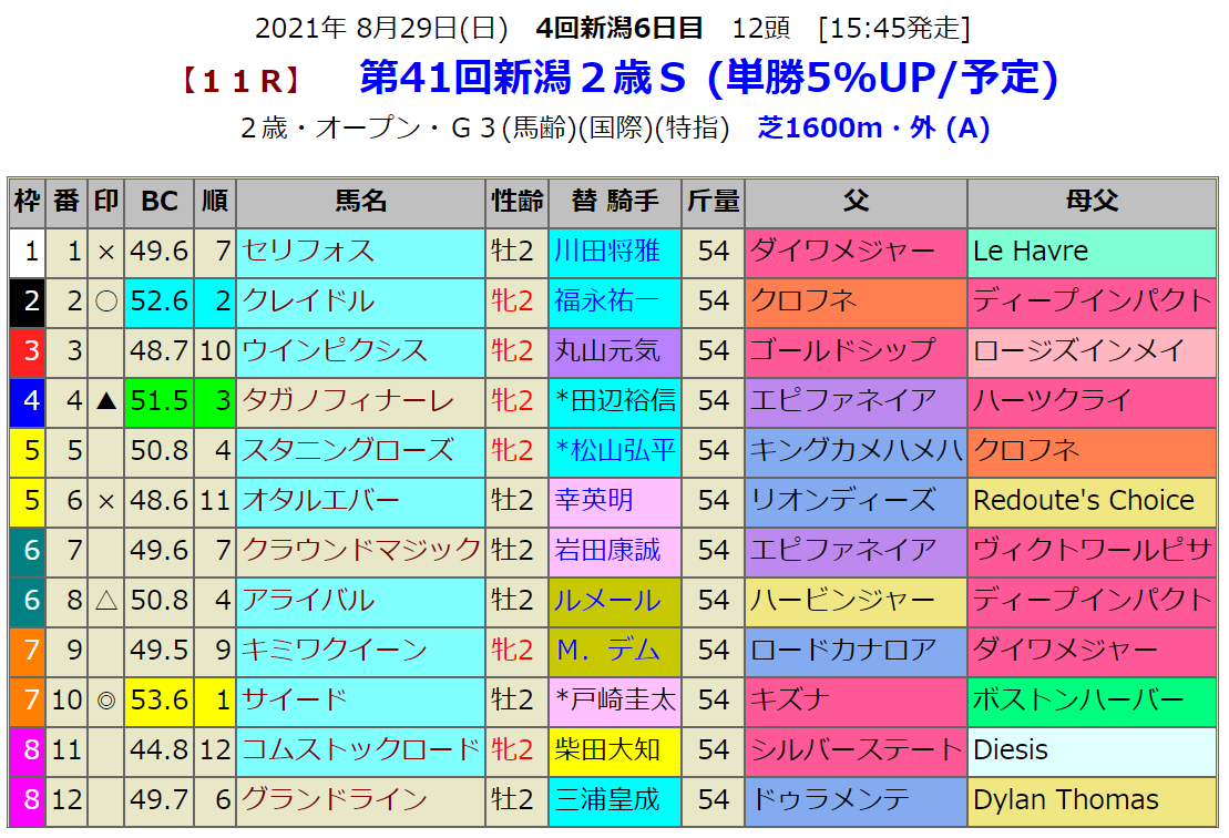 新潟2歳Sの指数1位はキズナ産駒のサイードです。前走は小倉の1200mで勝利ですから距離延長がどうなるのかが注目ですが血統的には問題ありません。人気はないようですが期待したいところです。