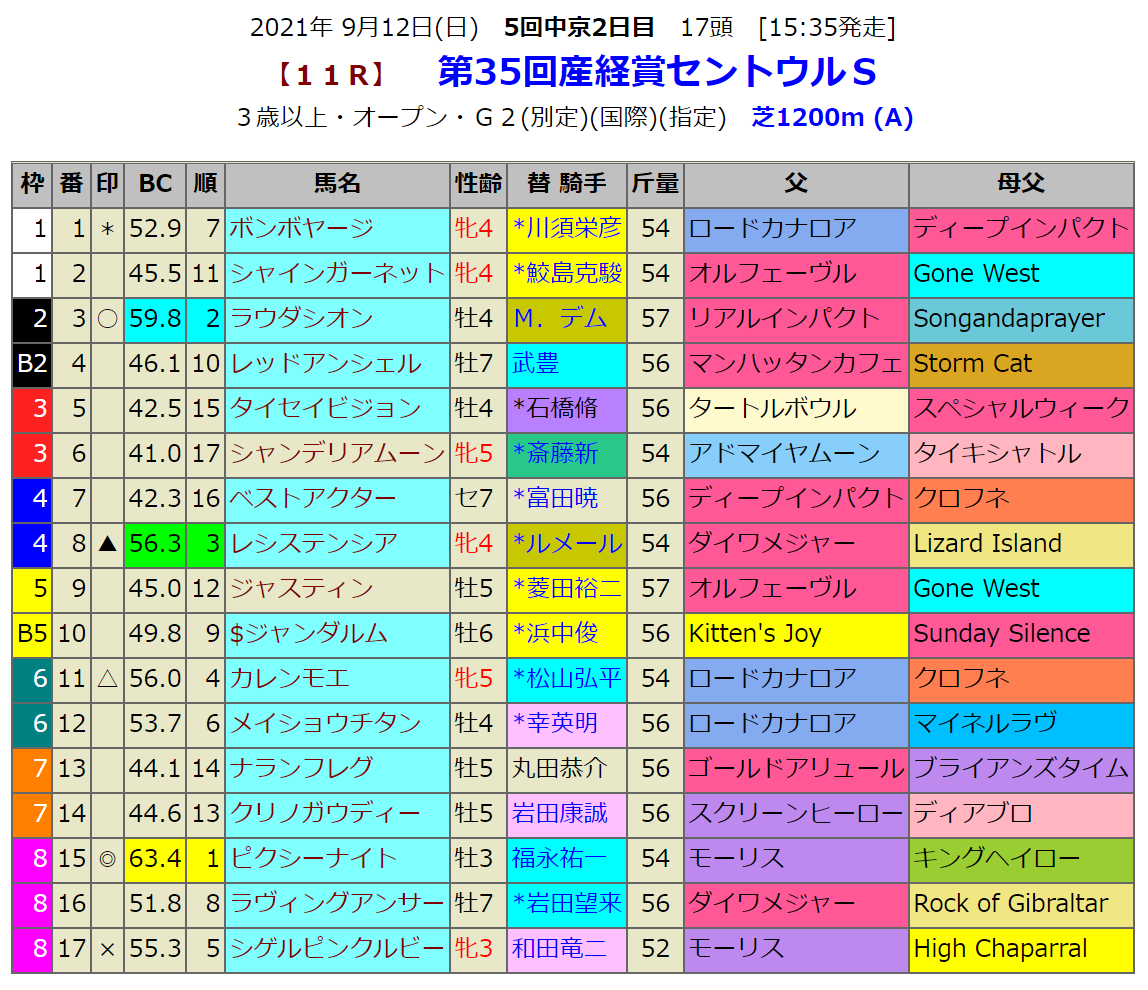 G2レースのセントウルSです。来月のG1,スプリンターズSつながるレースです。指数1位馬は3歳馬ピクシーナイトです。このレースは過去10年で2回は3歳馬が勝っています。年齢は特に気にしなくても良さそうです。ピクシーナイトはこれまで2勝ですがいずれも教理は違いますが中京競馬場です。前走の小倉でも福永騎手はこれからの手応えを感じたようなコメントを残しています。54Kを活かして好走を期待します。