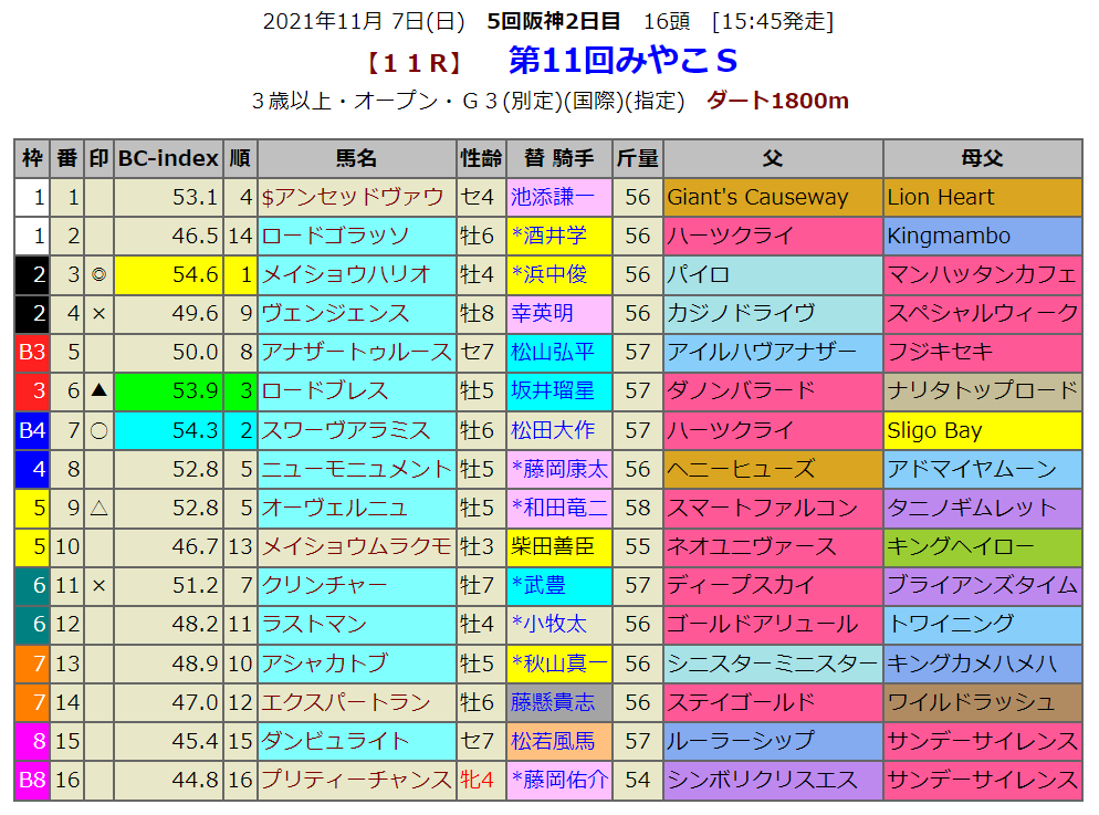 指数1位はパイロ産駒のメイショウハリオです。A.P. Indy系ですのでダートでの成績ばかりか回収率も良いので馬券の中心に置きたい産駒ではあるのですが、このパイロ産駒、実はダート重賞の勝ち馬が1頭しかいないのです。そろそろ2頭目の重賞勝ち馬が出てくれても良さそうですが、どうでしょう。