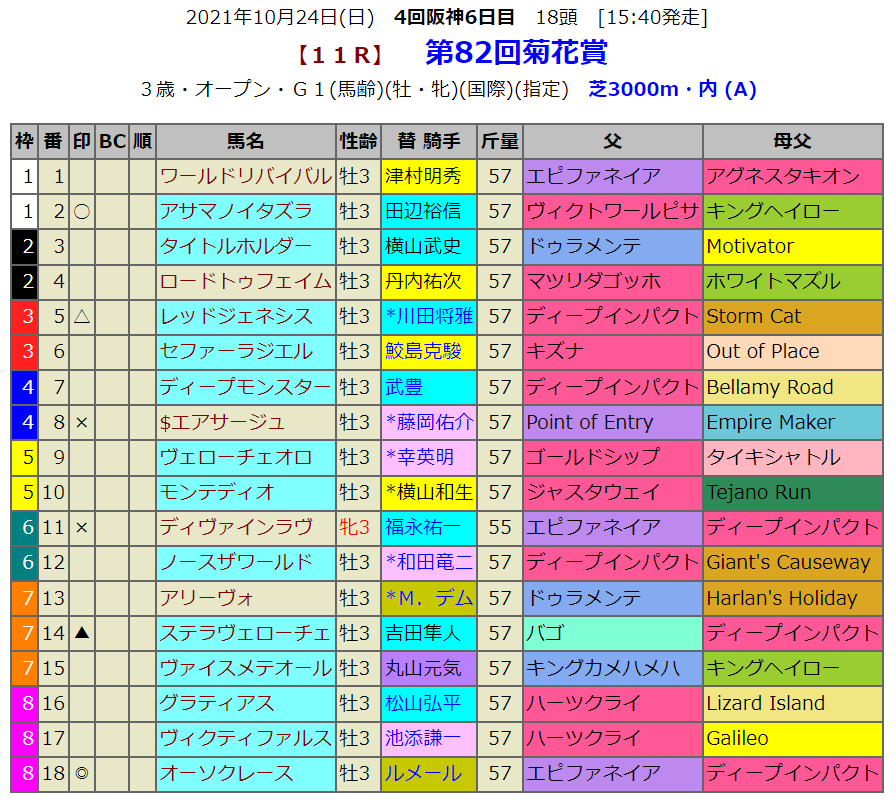 今年の菊花賞はG1馬は不在です。阪神競馬場で行われる菊花賞は混戦です。BC-indexの対象外のコースですので血統指数はありませんが血統を意識した予想をします。