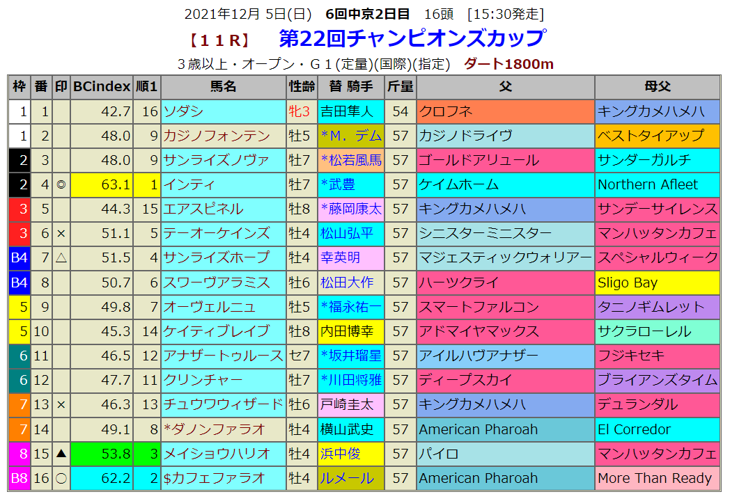 注目のソダシが指数最下位となってしまいました。父クロフネはこのレースの前身のJCダートの勝ち馬ですから親子制覇が懸かり血統的に問題がないように思えるのですが、場所が中京というのが指数が悪い原因のようです。母父キングカメハメハですからもっと指数が良くても良さそうですが、このコースには血統的にはよほど向いていないことです。指数1位はインティですが、2年前にフェブラリーSを勝ちこのレースも2年連続3着という成績で実績安定面からも推せます。前走芝で叩いたフェファラオも非常に気になります。