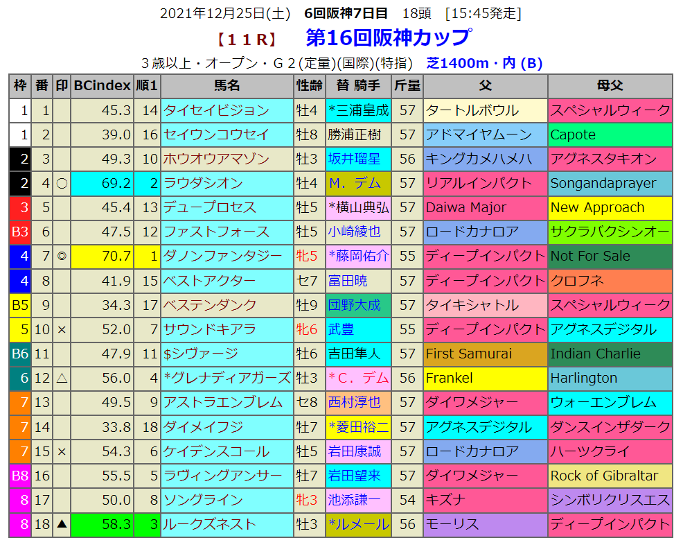 ついに今年の競馬も大詰めです。有馬記念がオーラスという習性から未だに脱却はできてないのですが、とにかく今年の競馬も残りわずかなのです。阪神カップもすっかりこの時期の定番重賞になった感しがします。とにかく連覇が多い重要なのですが今年も昨年の勝ち馬が出走してきます。・・・よく見ると明日は阪神でC.デムーロは全鞍騎乗です。頑張りますね。