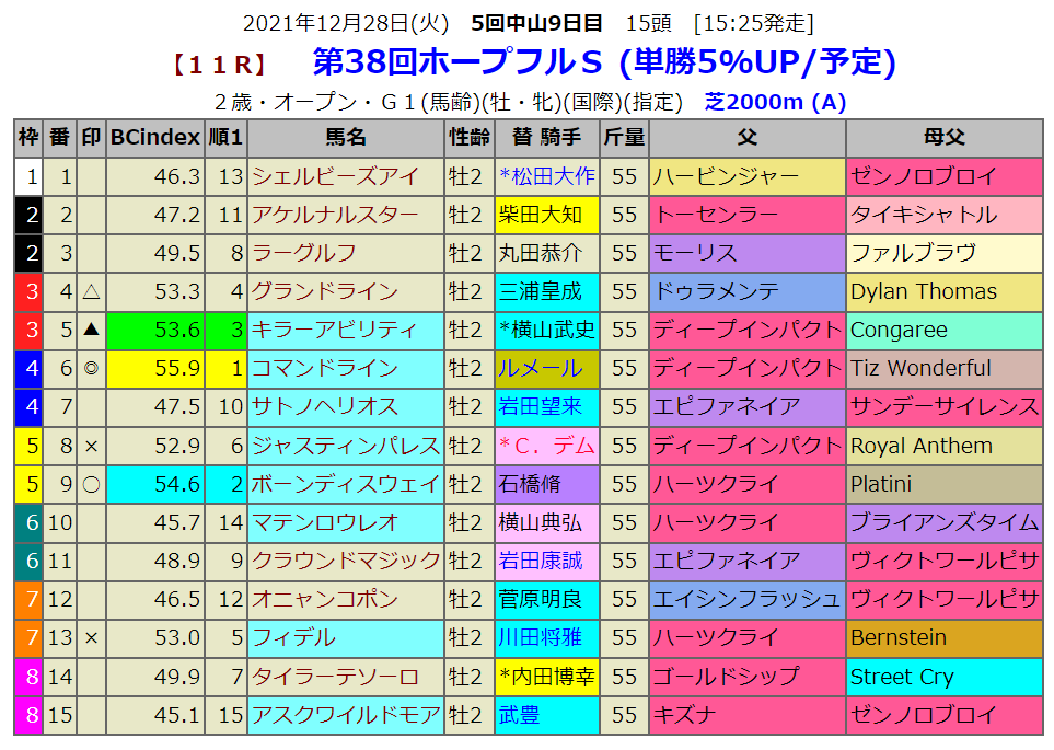今年最後のJRAの競馬です。ホープフルSはG1に昇格して今年で5回目となります。一昨年はあのコントレイルが勝っています。先週の朝日杯FSよりもクラシックでの評価は上のような気もします。皐月賞と同じコースで行われることがその理由ですが、中山の重賞でありながらステイゴールド系の活躍が無いのが残念のような気もしますが過去の出走馬をみると、そもそもあまり出走してないようです。