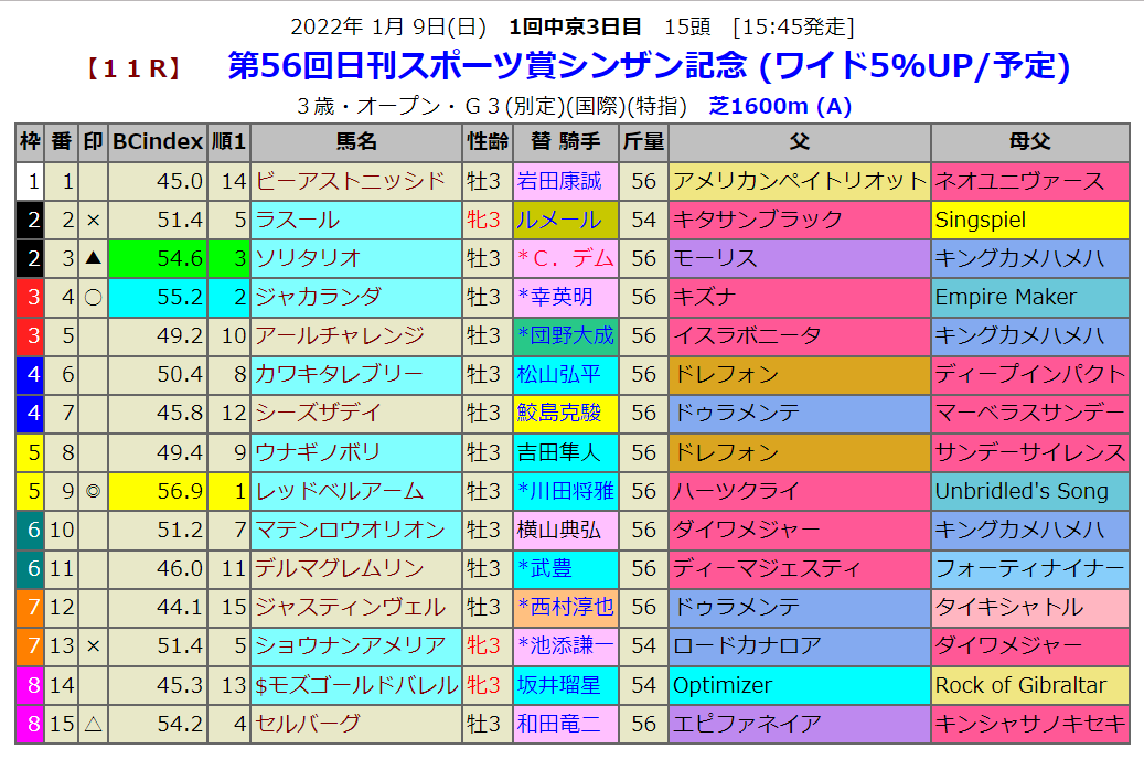 指数1位は重賞勝ち馬2頭を全兄にもつレッドベルアームです。兄たちは芝のマイル重賞を勝っていますので距離適性は問題ないはずです。1番人気はその注目の牝馬のラスールです。ルメール騎手も明日が今年の初騎乗のようです。キタサンブラック産駒ですからもう何頭かは重賞勝ちそうですが、ここは指数が上がりませんでした。