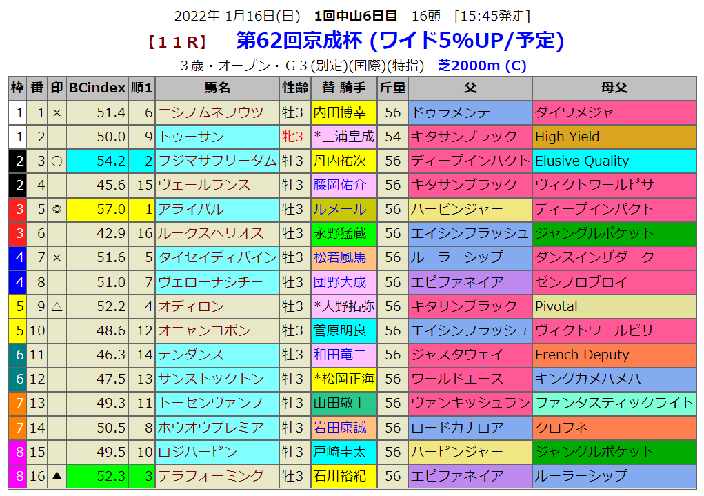 指数1位はアライバルです。1勝馬が多い中数少ない2勝馬の一頭です。前走新潟2歳Sではセリフォスに負けてますがその馬は朝日杯SFで2着した実力馬です。前走も内容は悪くなくルメールも引き続き騎乗で今年の初重賞勝利を狙います。ハービンジャー産駒はこのレース過去10年で2勝してますから期待できそうです。ただ何故か指数2位以下が人気薄馬に集中しています。JRAのキャンペーンに乗っかってワイドも買っておきたいと思います。