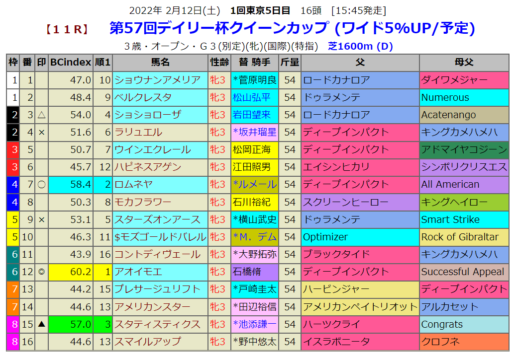 指数1位はディープ産駒のアイオモエです。過去このレースでは新馬勝ちから勝った馬は過去20年間いないのですが、アオイモエは前走新馬戦です。そのレース内容は良かったように見えます。傾向的にはG1組が人気になりますが、ここは2頭しかいません。気になるのは先週二つの重賞を勝ったハーツクライ産駒です。一頭出走しますからちょっと気になります。