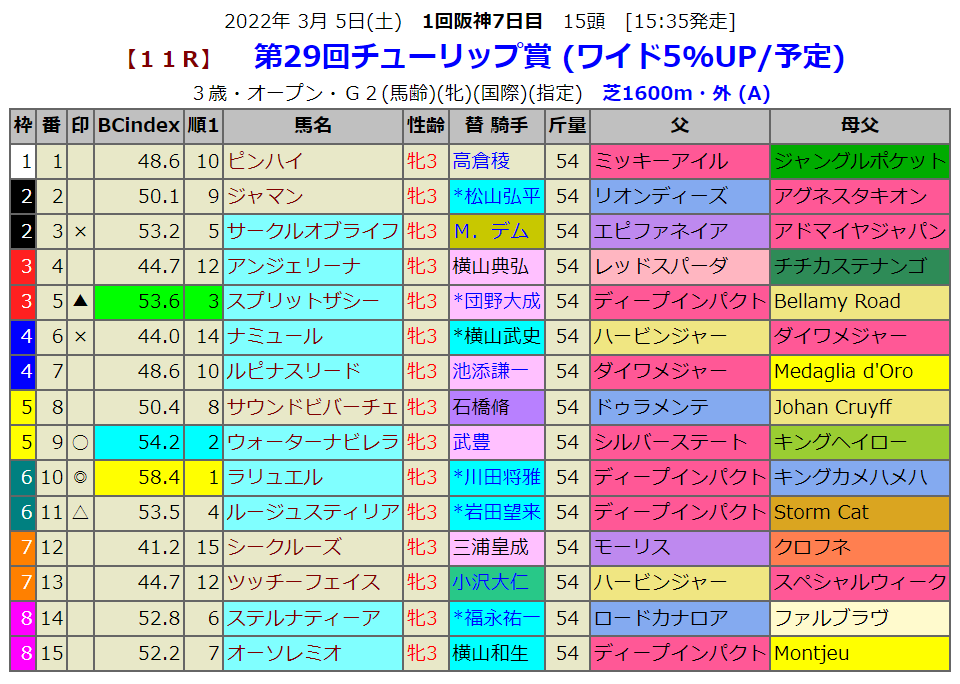 指数1位はディープインパクト産駒のラリュエルです。ディープインパクトは今年重賞はまだ1勝しかしていません。しかも母父キンカメです。阪神芝マイル戦、ここで勝たないと、とは思うのですが・・・。ラリュエルはあの2,3着が多いステイフーリッシュの妹ですから、2,3着を想定した馬券を厚めに買ってみようかと思います。