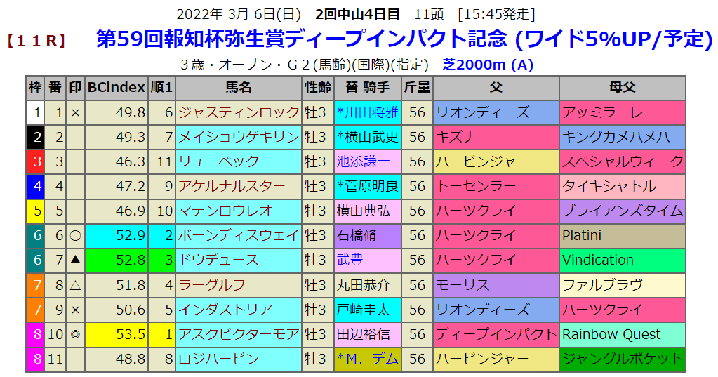 指数1位はそのディープインパクト産駒のアスクビクターモアです。今日のチューリップ賞はハービンジャー産駒が勝ちましたがここに2頭出走してきています。指数は下位なのですが、リューベックは09年にこのレースを勝ったロジユニヴァースのいとこで、母父スペシャルウィークも弥生賞馬です。ロジハービンの方も叔父に弥生賞馬アドマイヤムーンがいます。もう一頭、インダストリアの叔父は02年の弥生賞馬バランスオブゲームです。その辺の血の繋がりが気になりましが、指数上位から印をつけますがドウデュースが前回の指数9位から3位に上がってますからここは有力です。絡む馬券は厚めになります。