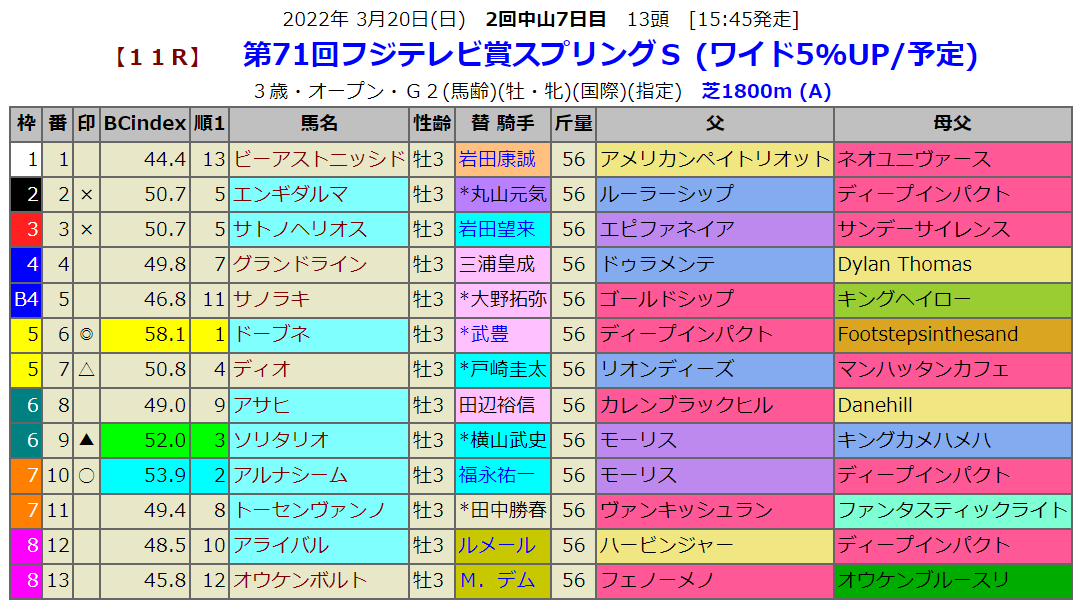 残念ながらオルフェーヴル産駒がいません。指数1位はあの5億円馬ドーブネです。距離延長ですが調教ではまずまずの動きを見せてくれてるようです。弟の調教馬に兄が乗るというので新馬戦のように期待してしまいます。ポツンと1頭だけディープインパクト産駒です。弥生賞と同じパターンですが、どうでしょう。