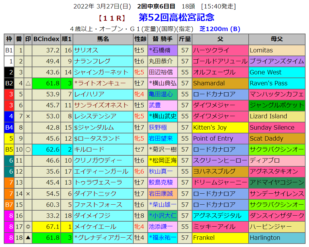 いよいよG1レースです。今年の最初のG1レース、フェブラリーSは見事BC-index指数1位馬が勝っているので、ここも指数1位馬に頑張ってもらいたいところです。昨年の勝ち馬は見事に指数1位馬のダノンスマッシュが勝ちました。ロードカナロア産駒ですから親子制覇となりました。今年はどうでしょう。ちなみに明日はこのG1勝ち馬の産駒には注目です。ロードカナロアの他にキンシャサノキセキやビッグアーサーあたりでしょうか。