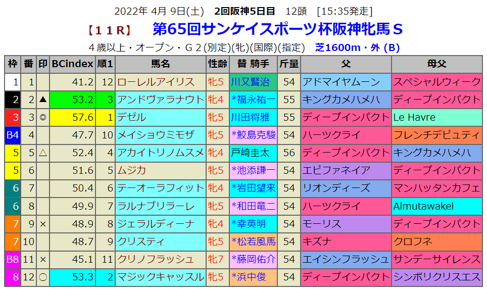 指数1位はデゼルです。昨年の勝ち馬ですが、その後マイル路線に舵を切らなかったのが気になりますが、前走復調したと見れば十分狙えます。ちなみに、アカイトリノムスメとジェラルディーナは母が桜花賞馬ですからこの2頭の血は桜花賞の週に同じコースでは印を回しておきます。