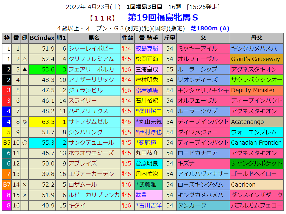 指数1位は6歳馬サトノダムルスです。6歳馬ですが、間隔を置いて使われています。厩舎の思惑が伝わってきそうです。中山牝馬S組が好走するレースですが、この馬が該当していないのは残念です。