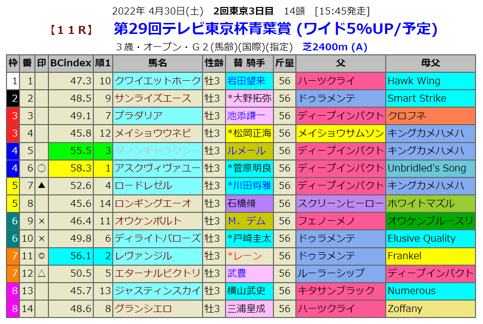 指数1位は芦毛のディープインパクト産駒のアスクヴィヴァユーです。ダノンプラチナの全弟ですから期待できそうですが流石にダート替りでは過去のデータから真っ先に消されてしまうので評価を一つ下げます。指数2位のレヴァンジルを本命にします。短期免許レーン騎手がいきなり重賞を勝つのはよくあることです。