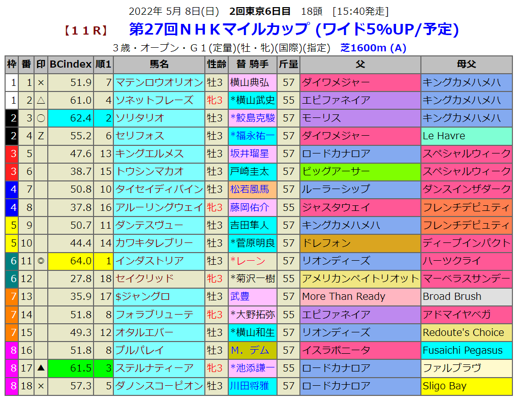 NHKマイルCはダイワメジャー産駒が好走するのですが今年も2頭出走し枠順も良く人気になっていますが、指数一位はインダストリアです。兄のケイデンスコールはマイル重賞を2勝しています。叔父には03年毎日王冠を勝ったバランスオブゲームを持つ血統です。正月のジュニアCを勝った時の調教師のコメントが「純粋に脚力が違う勝ち方でしたね。気持ちに難しいところがあるので、正しい方向へ進んでいけるように調整していきたいです。この後は一度放牧に出します。春は多分NHKマイルCが目標になると思うので、その前に1戦どこか使うことになるかなと思います」です。前走は叩き台だったようです。ちょっと癖のある馬のようですが、距離短縮で迎える今回は鞍上強化で十分に狙えます。相手選びが難しく今回は少し手広く馬券購入です。