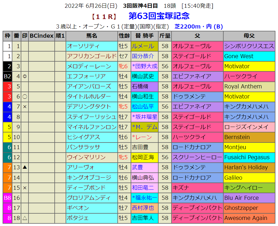 宝塚記念は阪神の2200mのコースで行われるので、残念ながら血統指数は無いのですが、当然血統面を意識した予想となります。