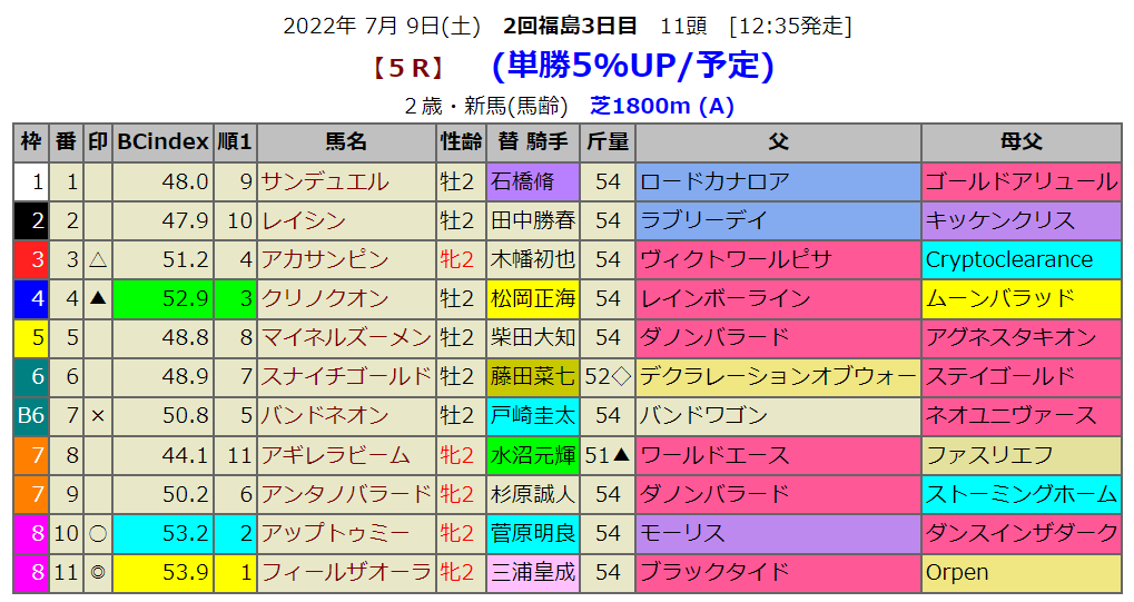 指数1位は大外アップトゥミーです。人気は血統的に隣のアンタノバラードになりそうですが、良血馬が新馬で勝てないレースは何度も見ています。前売りの3番人気はロードカナロア産駒ですが無印です。母父ゴールドアリュールですからダートに変わってから期待したいところです。