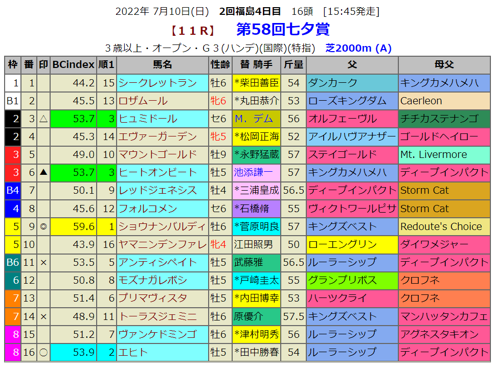 指数1位はショウナンバルディですが、指数3位のヒートオンビートが鉄板だと思っていました。池添騎手も確かtwitterで前走後、ここに照準といった意味のつぶやきをしていたような気がします。とはいってもこの時期のハンデ重賞ですからそれなりに予想が難しくなります。素直に指数1位馬から買っていきたいと思います。ショウナンバルディは昨年はこのレース3着でした。巻き返しに期待です。また気になるヒートオンビートですが、叔父にこの七夕賞を勝ったグランデッツァを持つ血統です。この馬もやはり気になります。