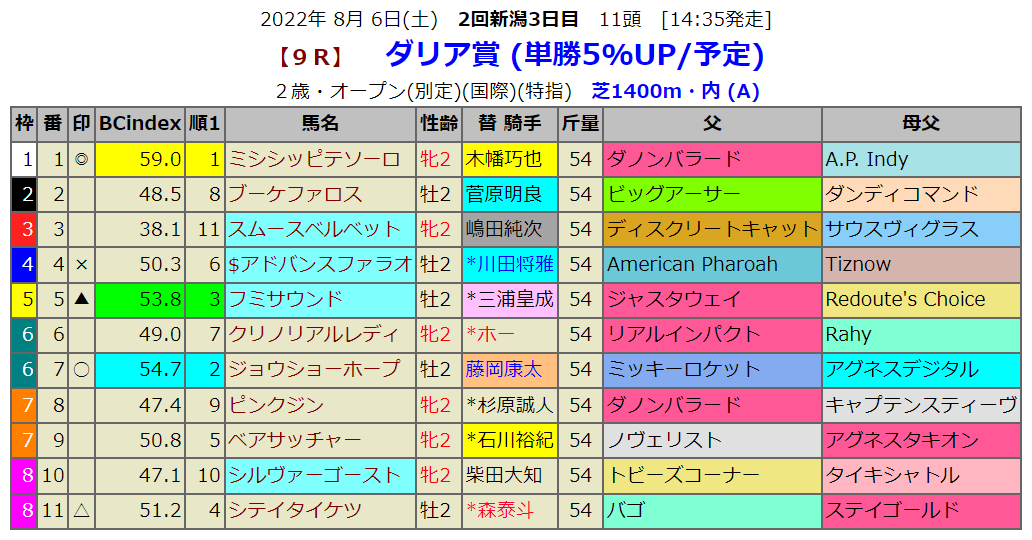 指数1位は内枠ミシッピテソーロです。新馬戦は7番人気で直線一気に突っ込んでの勝利でした。東京組はこの一頭です。未勝利馬を避けてるような指数順位です。