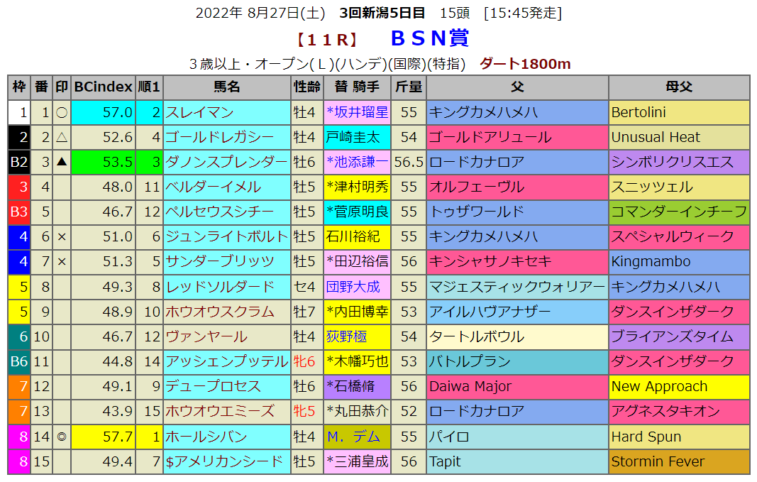 指数1位はパイロ産駒のホールシバンです。4歳馬ですがまだこれが10戦目です。ダートで4連勝した馬ですからオープン特別は勝ち上がってくれると思いますが、このコースでは未勝利戦では2着馬を5馬身突き放して勝利しています。