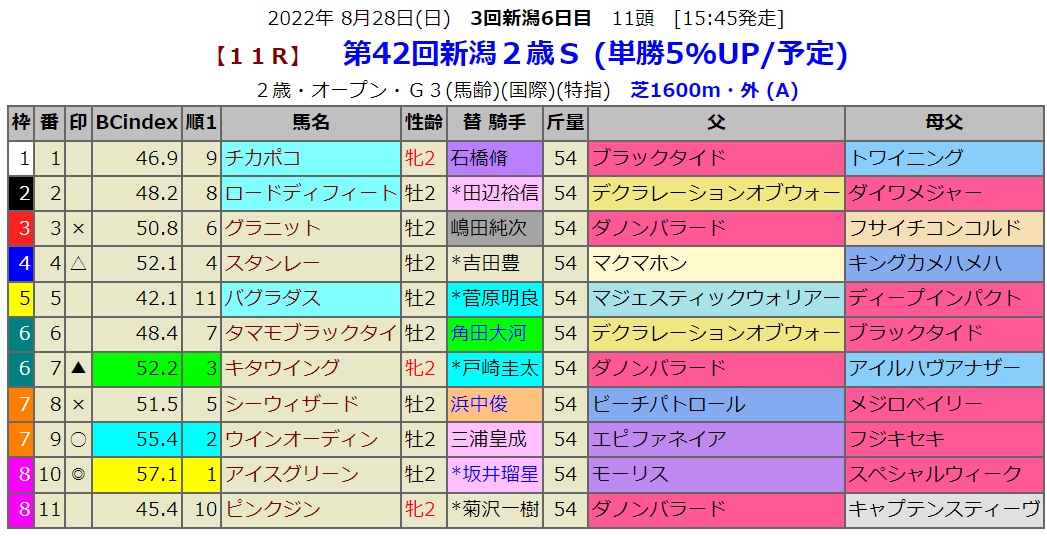 指数1位はモーリス産駒のアイスグリーンです。指数2位はウインオーディンですから、Roberto系が上位を占めています。今日の同コースで行われた新馬戦も勝ったのはRoberto系でした。とはいっても10Rの長岡Sでは指数1位のモーリス産駒は5番人気で15着に大敗しました。という事で次は勝つ番だと都合よく考えます。