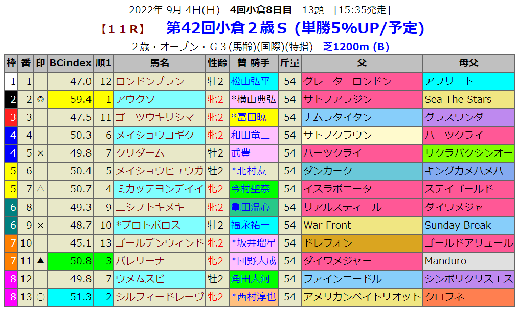 いよいよ夏競馬も終わりです。今日の重賞は外れてしまいましたが久々に指数1位馬が単勝万馬券になりました。その辺に満足しないで明日の2歳重賞の血統指数です。