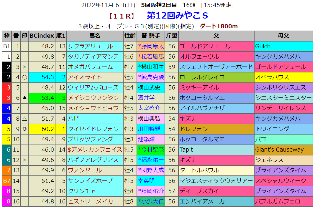 指数1位はドレフォン産駒のタイセイドレフォンです。ドレフォン産駒ではあのジオグリフがいますが、まだダート重賞勝ち馬はいません。高いダート適性のある産駒が多いので間違いなくこの世代でもダート重賞は勝ってくれるかと思います。