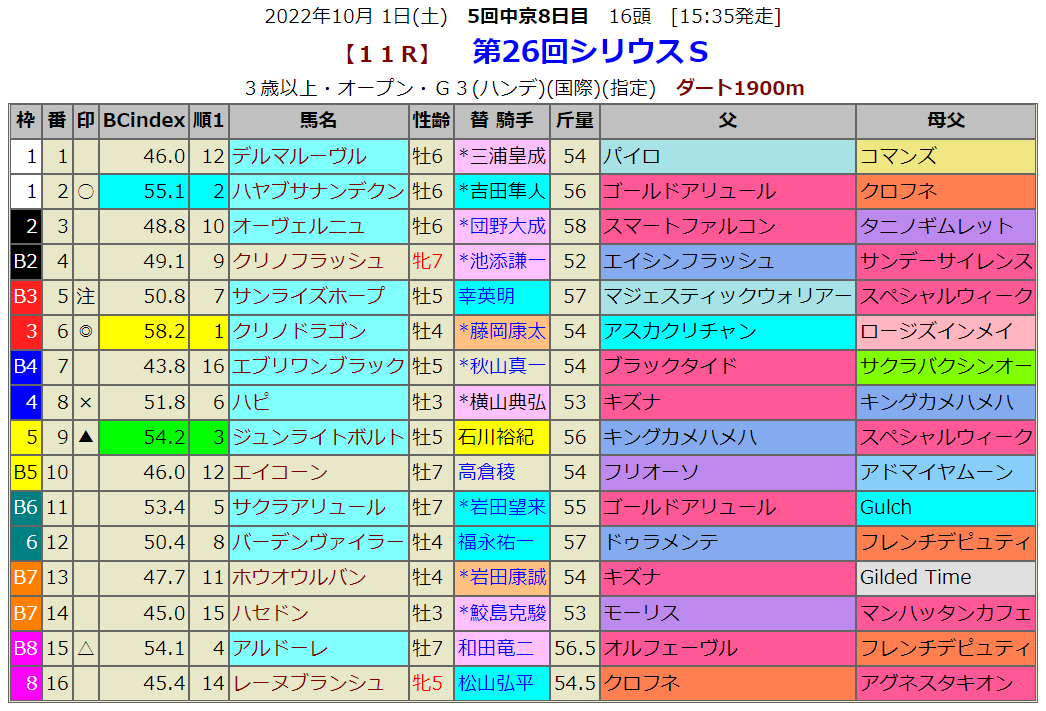 指数1位はクリノドラゴンですが、ここは昇級初戦になります。そんな時の指数の使い方は、2,3位馬や前走から指数順位がが大きくUPした馬が注目になります。