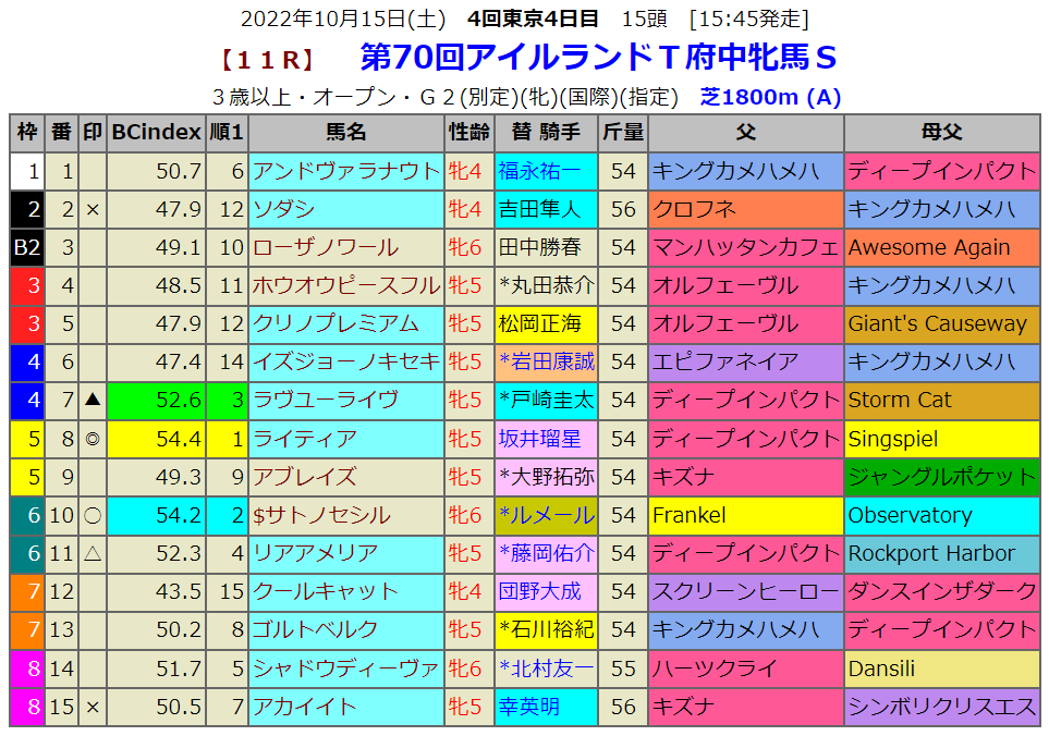 昨年の勝ち馬シャドウディーヴァまで印が廻りませんでした。指数1位はライティアです。重賞挑戦は2歳時以来となりましたがオークス馬を姉に持つ血統です。姉妹は重賞を勝ってる馬が多く、さらにディープインパクト産駒ですから、この辺で重賞を一つぐらいは勝ってくれそうです。当然ソダシが人気を集めてくれるレースですので狙っていきたいところです。