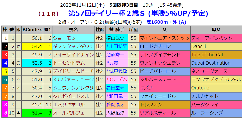 指数1位はダノンタッチダウンです。ホープステークスを勝ったダノンザキッドの半弟という血統ですが、このレースはどちらかというと朝日杯FSの方に繋がるケースが多いようです。その辺が少し気になりますが、一勝馬だけの今年のレースでは軸には十分です。