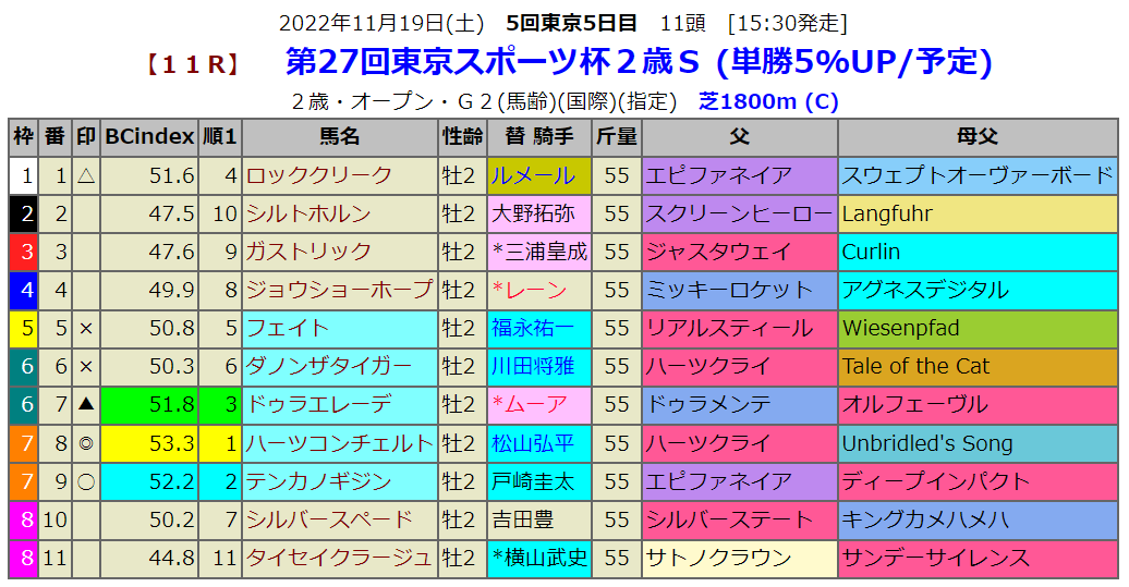 今週はマイルチャンピオンシップがあり、その前に2歳重賞東スポ杯2歳Sです。ちなみにこの二つのレースを勝っている馬は過去に1頭いました。2010年のこのレースの勝ち馬サダムパテックです。ちなみに今週はこの馬の近親が出走します。
