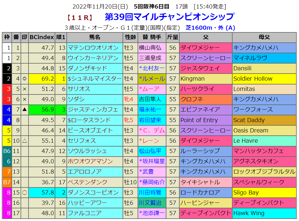 指数1位はシュネルマイスターです。春の安田記念は2着でした。そして昨年のこのレースも2着でした。3歳時はNHKマイルCを制していますから、マイル適性は高い馬です。