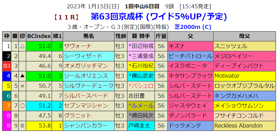 先週のシンザン記念もそうでしたが、3歳重賞の出走頭数が少ないです。京成杯は9頭の出走です。指数1位は大外シャンパンカラーです。東京のマイル戦を2戦2勝しています。どちらも指数1位でした。BC-indexとは最も相性のいい馬です。