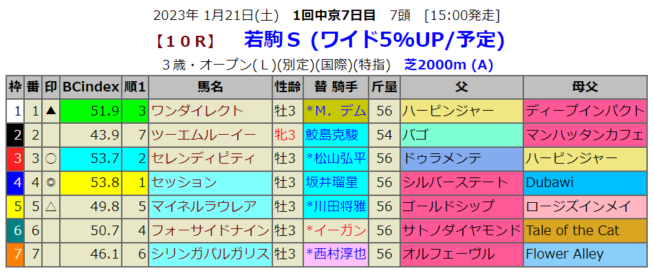 頭数を絞らなければいけないレースです。この世代、牝馬が強いと思われるのですが流石にここは印が回りません。指数4位と5位を入れ替えて印をつけましたがどうでしょう。