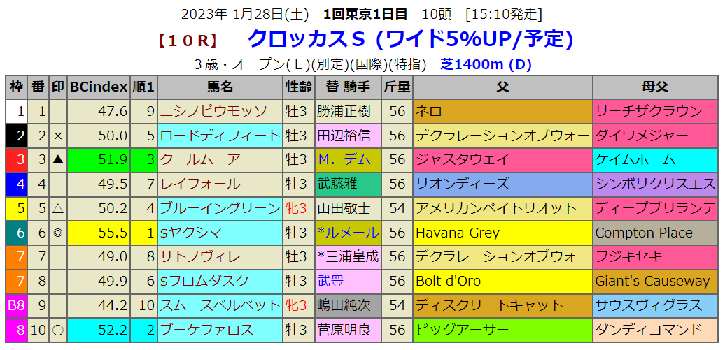 指数1位は外国産馬ヤクシマです。馬名が外国産馬らしくないのはひとまず置いておいて、最近のルメールも今一つ頼りないので狙いは指数2位のビッグアーサー産駒ブーケファロスも軸に据えたいところです。