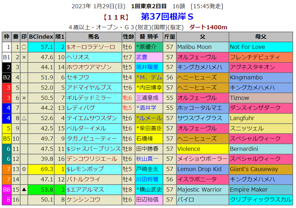 指数1位はレモンポップです。前売りでは圧倒的な人気のようです。指数2位3位にはA.P. Indy系が続いています。前走はギルデッドミラーに負けてるのですが、前売りでは逆転しています。とにかくこのコースでは4戦全勝ですから、人気になっていまいます。ここで人気に事得るようならフェブラリーSでも有力馬になります。