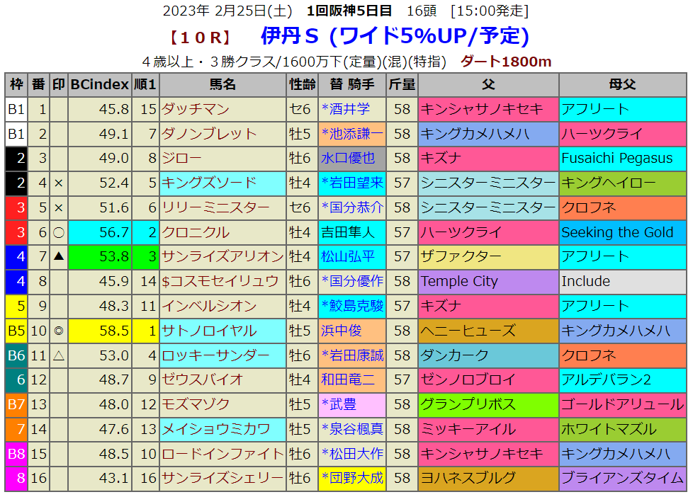 この伊丹Sのワイドは5%アップにはなりません。TARGETのミス表示です。このレースは指数通りに印をつけてみました。指数1位はヘニーヒューズ産駒のサトノロイヤルです。このところダートでは勝ちまくっています。