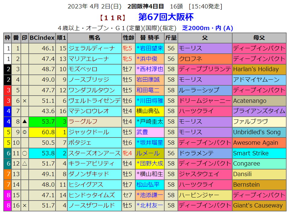 ディープインパクト産駒がこのレースでは好走してるのですが、そろそろ時代の変わり目なのかもしれません。モーリス産駒のジャックドールが指数1位となりました。昨年の覇者ポタジェは昨年は指数3位でしたが、今年は無印となりました。