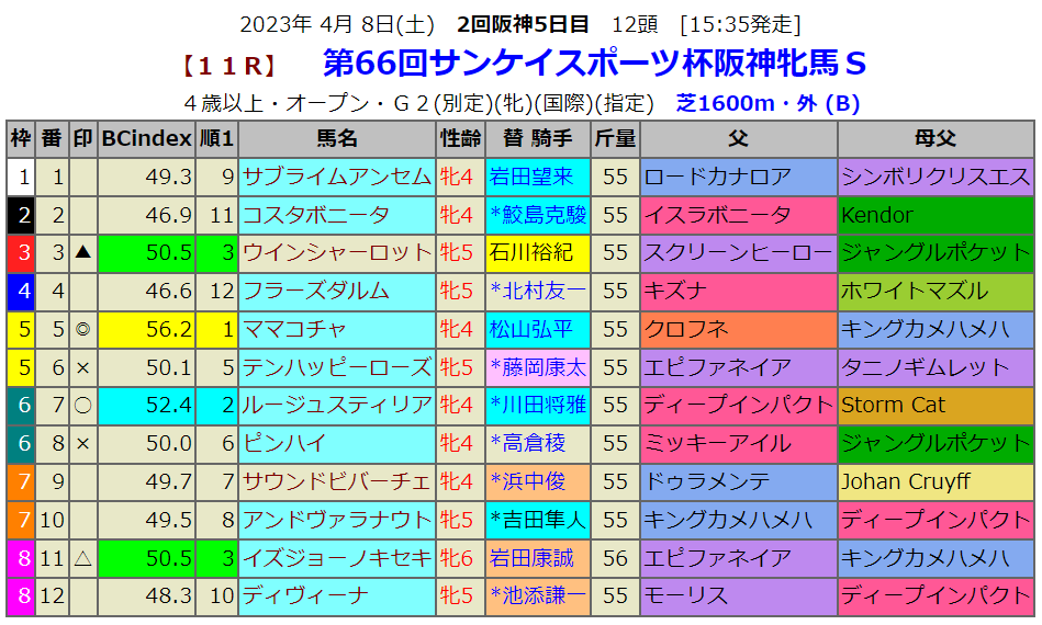 指数1位はママコチャです。桜花賞馬ソダシの全妹ですから今週は激走しても不思議はありません。姉ソダシはマイルG1を3勝してますので、その妹の好走が十分に期待できます。前走のターコイズSでは0.2差の5着でしたがレース後の騎手のコメントは「まだ成長できる馬だと思います。次に期待したいです」でした。