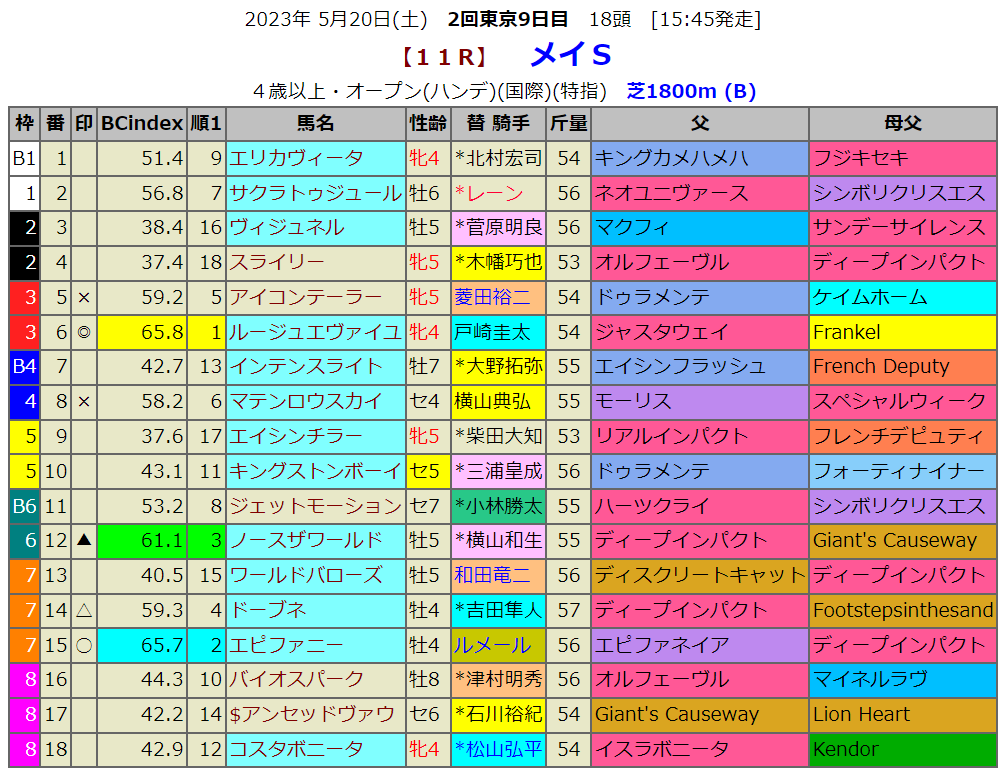いよいよオークスウィークです。明日の重賞は平安Sですが、新しい京都競馬場という事でまで血統指数BC-indexがありません。そこで東京メインのメイSの血統指数予想です。