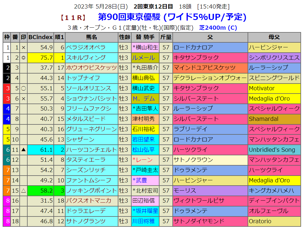 指数1位はスキルヴィングです。青葉賞勝ち馬です。ルメール騎手が皐月賞で乗ったファントムシーフじゃなくこの馬を選んだ経緯は分かりませんが、基本皐月賞上位馬から狙うのがダービー予想の基本ですが、青葉賞勝ち馬がダービーを制したことは無いはずです。