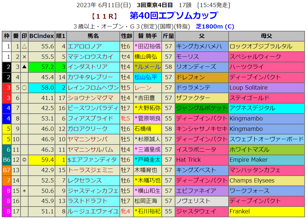 エプソムCの指数1位はエアファンディタです。典型的な差し馬です。既にリステッド競争では2勝しており、G3のこのクラスでは馬券には絡んでくれそうな軸馬です。