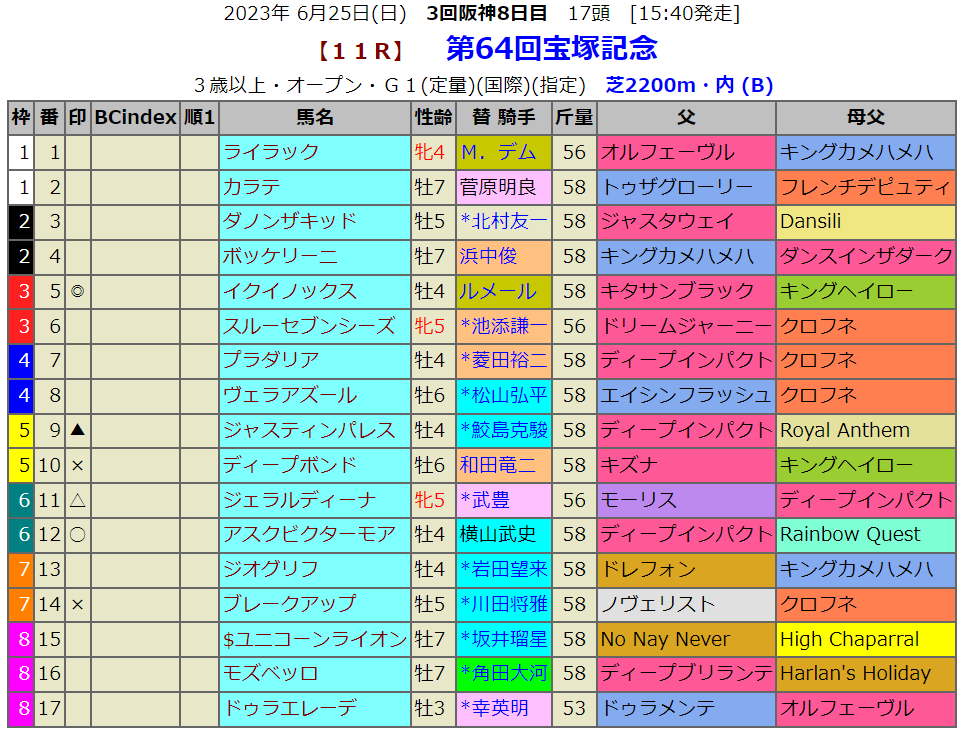 宝塚記念のコースはBC-index対象外なので指数はありませんが当然予想はします。世界一強い馬の相手探しですが、第1候補はアスクビクターモアです。前走は不利などもあったので度外視して、菊花賞馬の意地を見せてほしところです。残り少ないディープ産駒の活躍はどうしても期待したいものです。