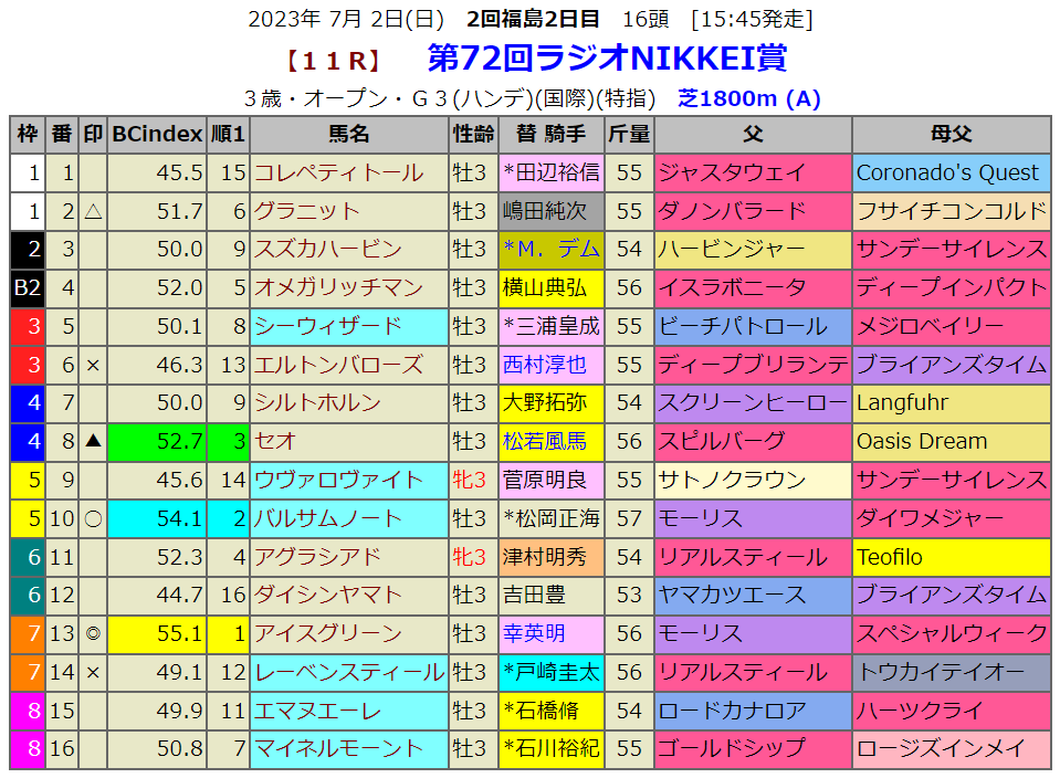 夏の重賞はハンデ戦は多いのですが、当然、血統指数はコース適性を指数化してるので全く斤量はファクターとはなっていません。予想の上では、その辺の注意も必要になります。