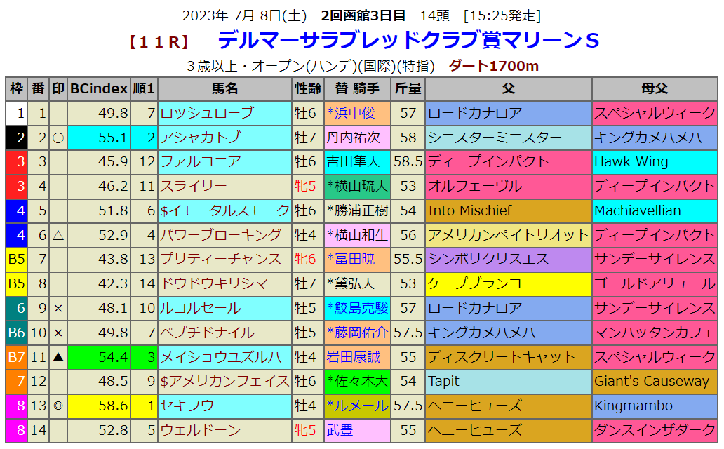 指数1位はセキフウです。ルメール鞍上で1番人気に推されてるようですが・・気になるのは売り出し中の佐々木騎手。印が廻らなかったのですが、オッズを見て付け足したいような・・