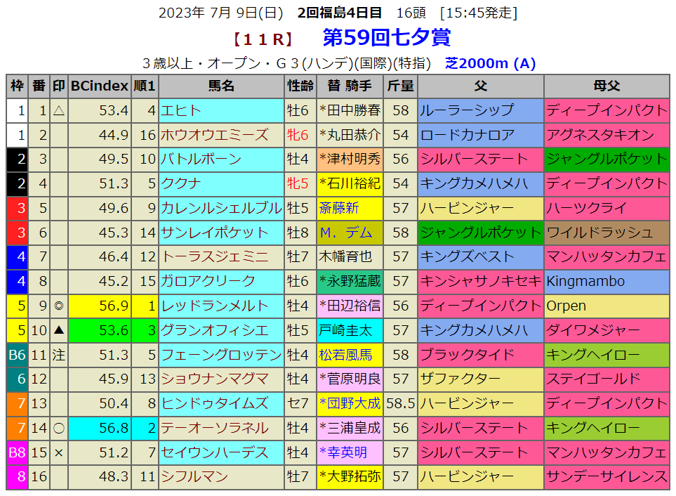 指数1位レッドランメルトでした。現役では少なくなっているディープインパクト産駒ですが、前売りでは12番人気です。フェーングロッテンは前走指数は8位でしたが、ここでは5位とアップしました。こういう馬も狙いたいのですがこのレース1番人気が苦戦しているという傾向があります。現在2番人気ですが、1番人気にならないことを願ってここから流したいと思います。